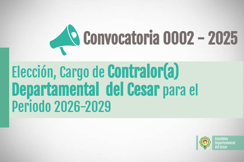 La Asamblea del Cesar informa a la ciudadanía en general que el proceso de inscripción y recepción de hojas de vida para el cargo de Secretario General de la Asamblea del Cesar, por el periodo restante de la vigencia 2025, se llevará a cabo los días 22 y 23 de abril de ...